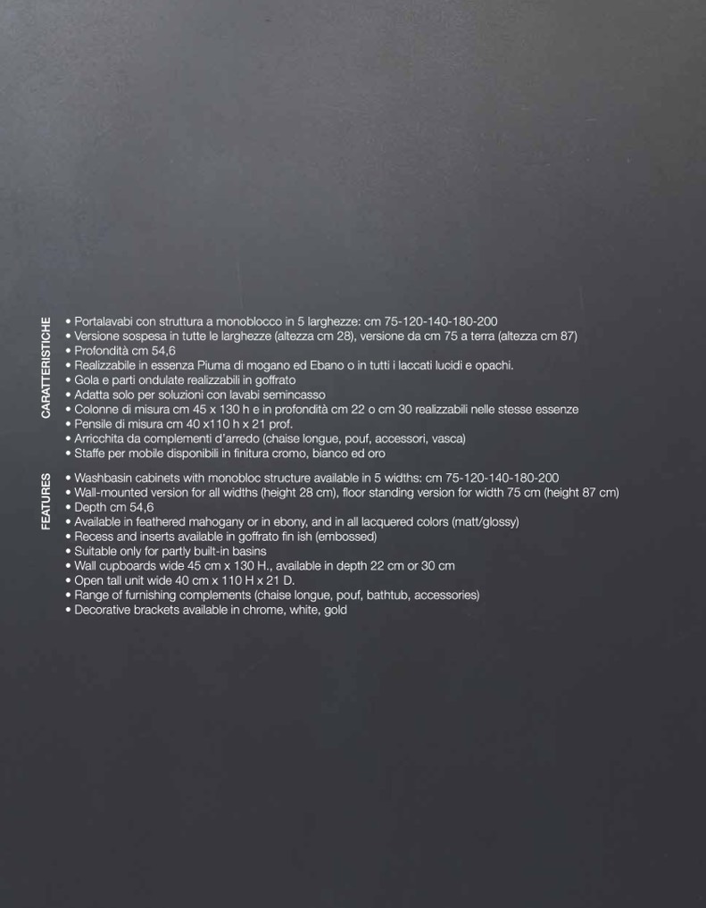• Washbasin cabinets with monobloc structure available in 5 widths: cm 75-120-140-180-200