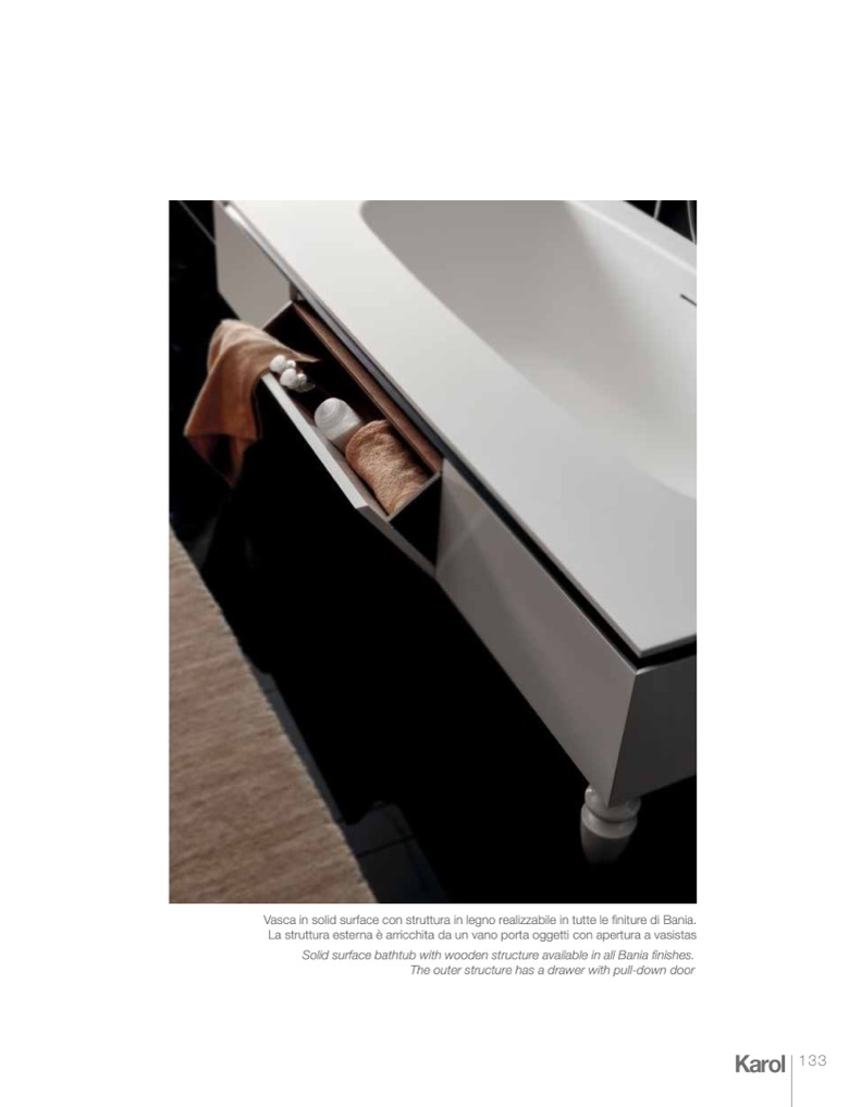 Solid surface bathtub with wooden structure available in all Bania finishes.