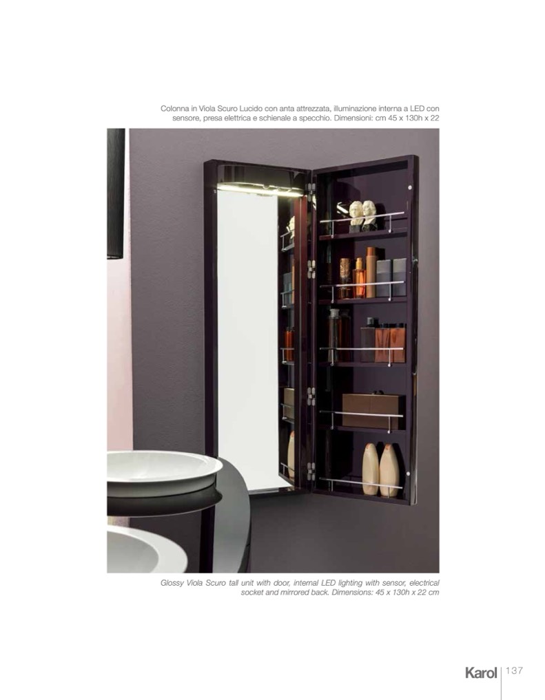 Glossy Viola Scuro tall unit with door, internal LED lighting with sensor, electrical