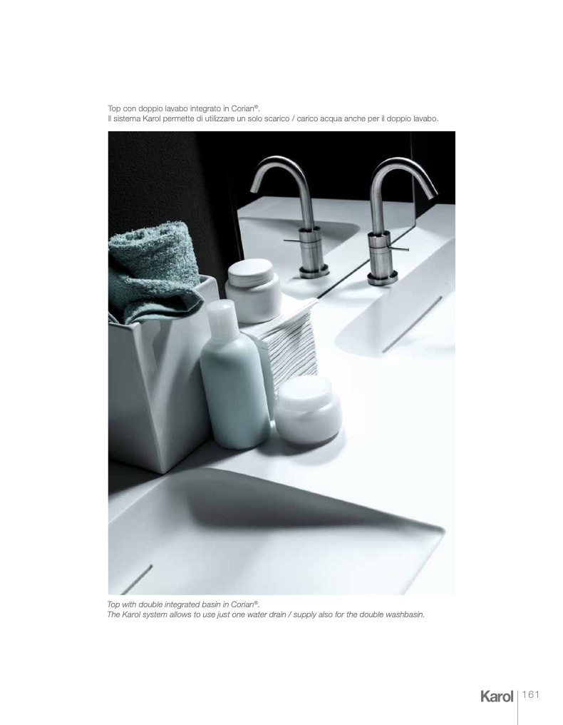 Il sistema Karol permette di utilizzare un solo scarico / carico acqua anche per il doppio lavabo.