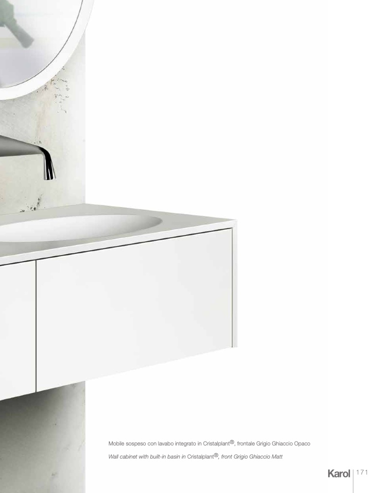 Wall cabinet with built-in basin in Cristalplant®, front Grigio Ghiaccio Matt