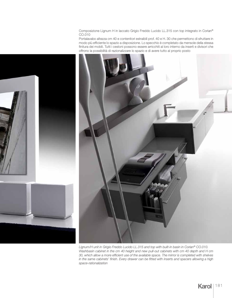 Lignum/H unit in Grigio Freddo Lucido LL.315 and top with built-in basin in Corian