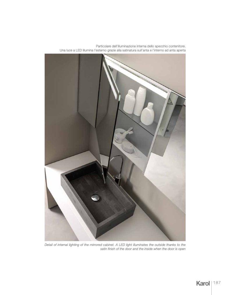 Detail of internal lighting of the mirrored cabinet. A LED light illuminates the outside thanks to the