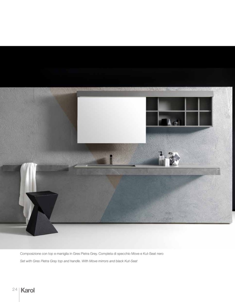 Composizione con top e maniglia in Gres Pietra Grey. Completa di specchio Move e Kut-Seat nero