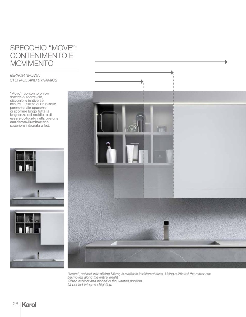 “Move”, cabinet with sliding Mirror, is available in different sizes. Using a little rail the mirror can