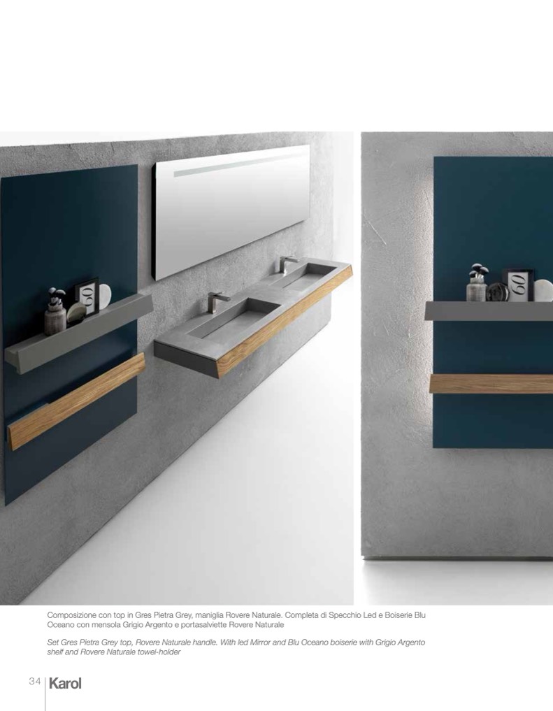 Set Gres Pietra Grey top, Rovere Naturale handle. With led Mirror and Blu Oceano boiserie with Grigio Argento