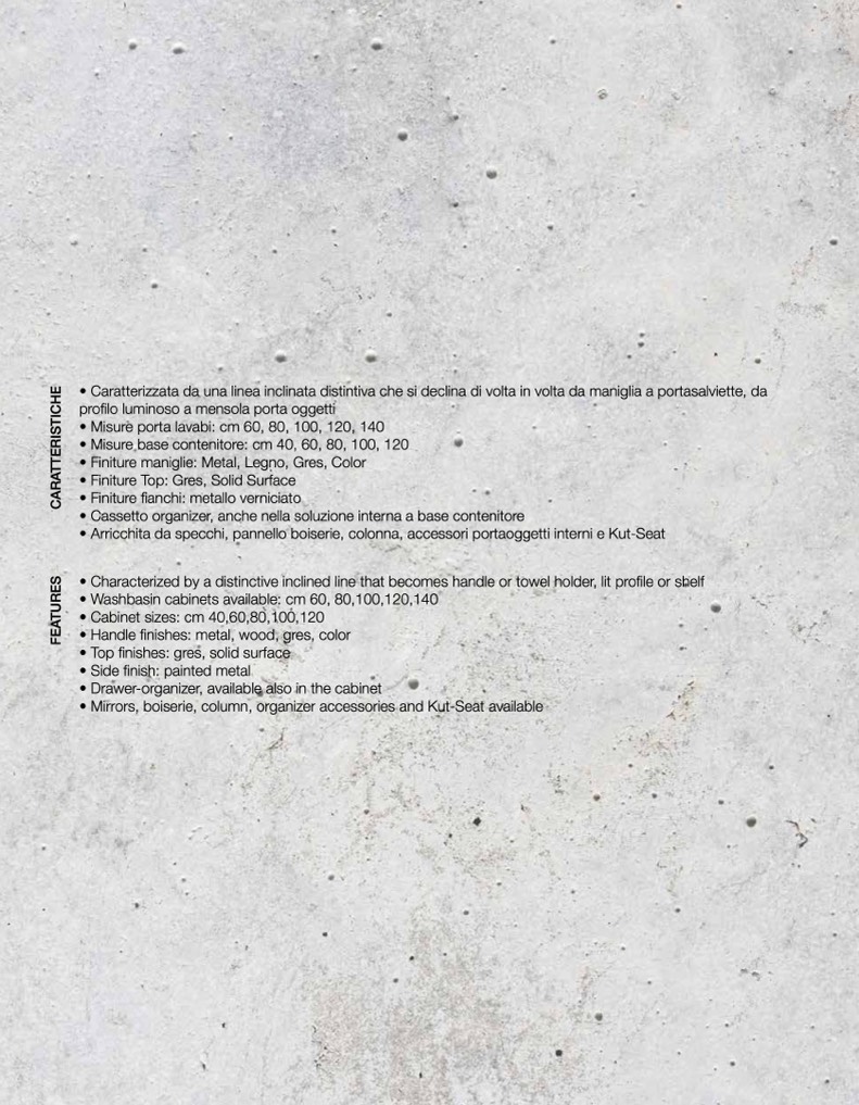 • Characterized by a distinctive inclined line that becomes handle or towel holder, lit profile or shelf