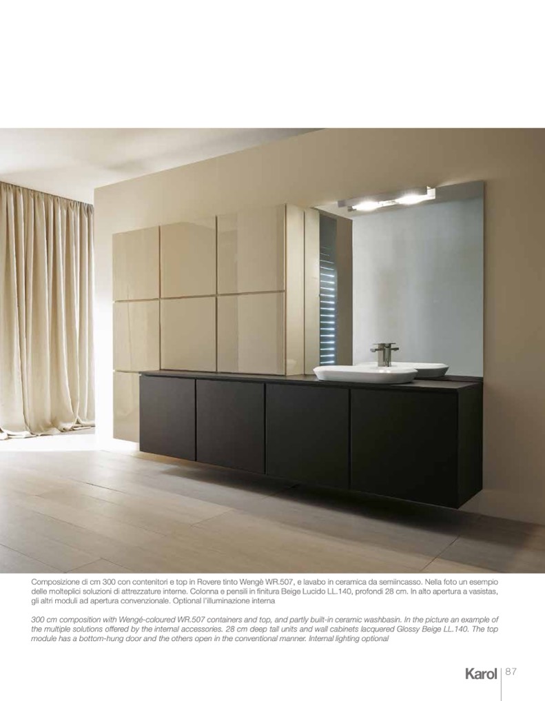 the multiple solutions offered by the internal accessories. 28 cm deep tall units and wall cabinets lacquered Glossy Beige LL.140. The top