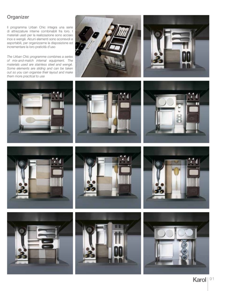 inox e wengé. Alcuni elementi sono scorrevoli e