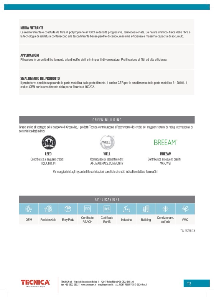 la tecnologia di saldatura conferiscono alla tasca filtrante basse perdite di carico, massima efficienza e massima capacità di accumulo.