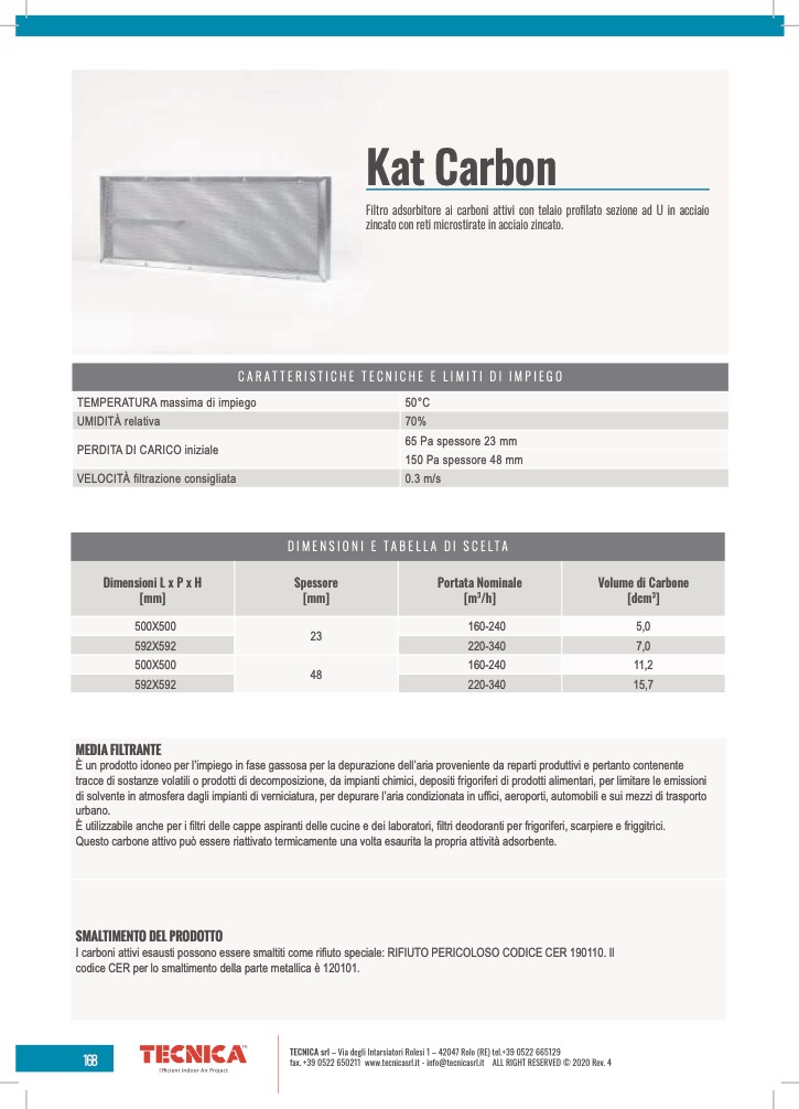 I carboni attivi esausti possono essere smaltiti come rifiuto speciale: RIFIUTO PERICOLOSO CODICE CER 190110. Il