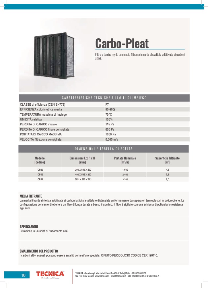 Filtro a tasche rigide con media filtrante in carta plissettata additivata ai carboni