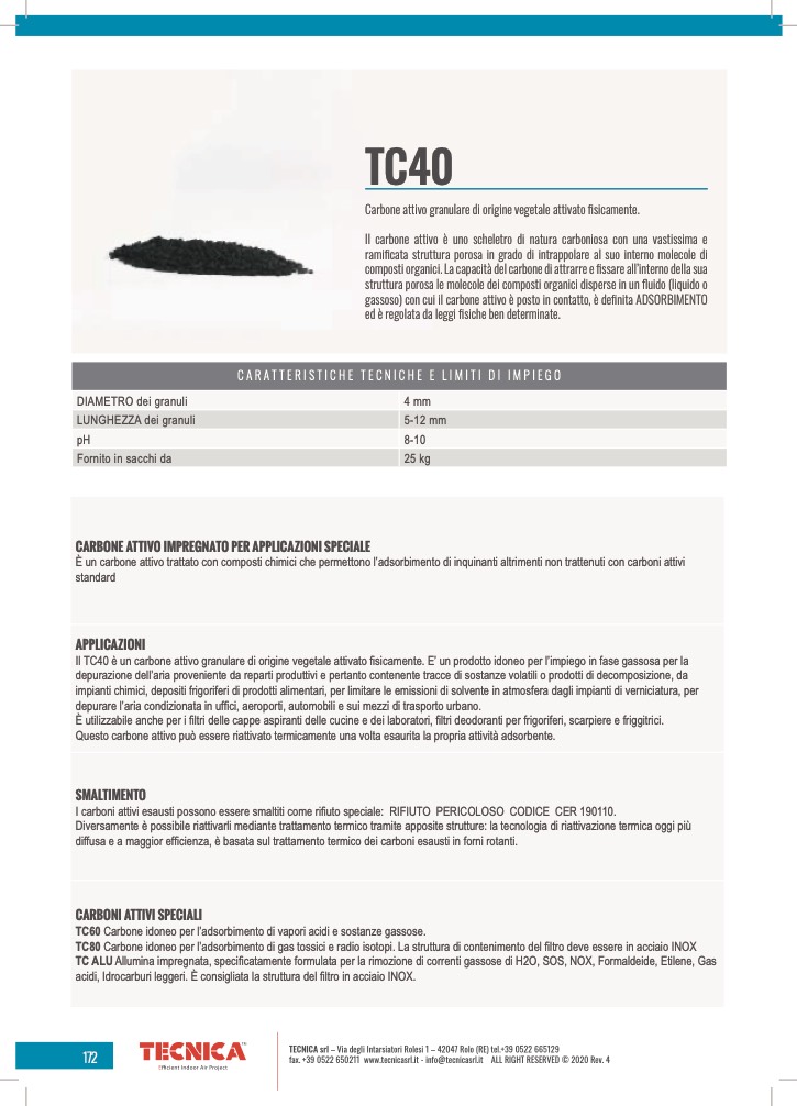Il TC40 è un carbone attivo granulare di origine vegetale attivato fisicamente. E’ un prodotto idoneo per l’impiego in fase gassosa per la