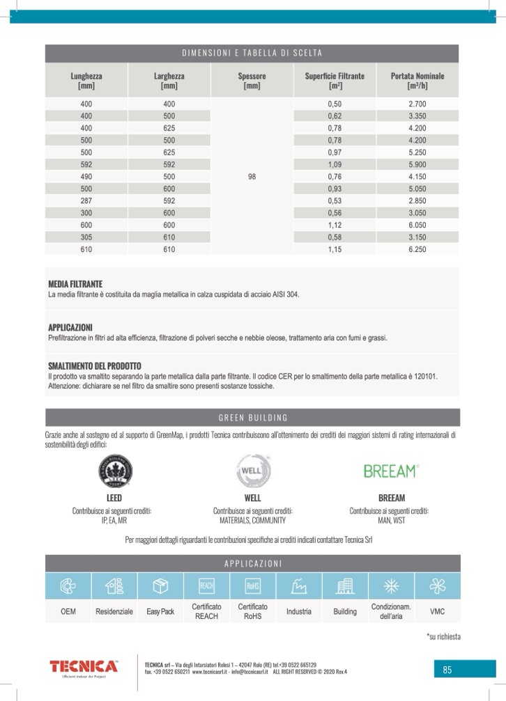Prefiltrazione in filtri ad alta efficienza, filtrazione di polveri secche e nebbie oleose, trattamento aria con fumi e grassi.