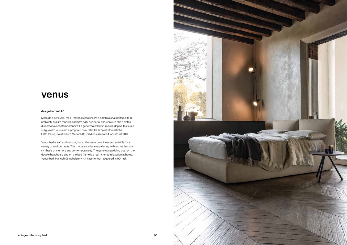 Venus bed, Marluch 05 upholstery, h.4 vasetto foot lacquered in 9011 ral.