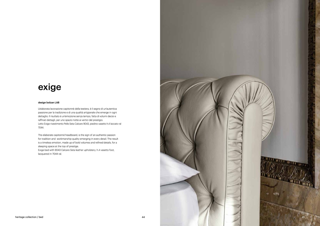 Exige bed with 9043 Calcare Seta leather upholstery, h.4 vasetto foot,