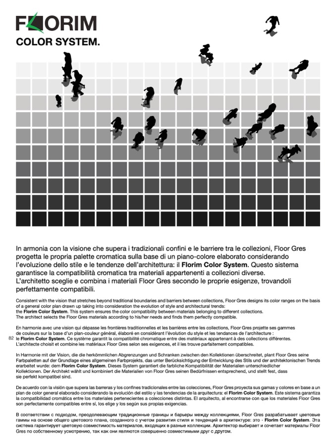 82 le Florim Color System. Ce système garantit la compatibilité chromatique entre des matériaux appartenant à des collections différentes.