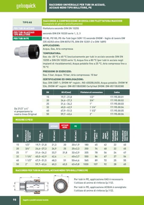 impianti di riscaldamento); Acqua potabile fino a 25 °C; Aria compressa fino a