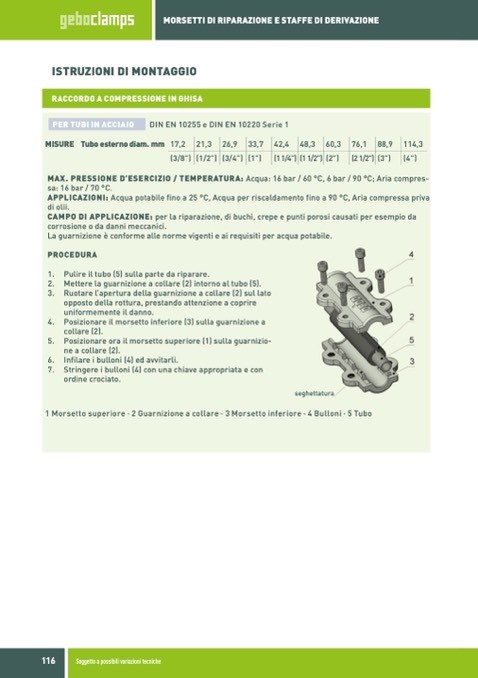 1 Morsetto superiore · 2 Guarnizione a collare · 3 Morsetto inferiore · 4 Bulloni · 5 Tubo