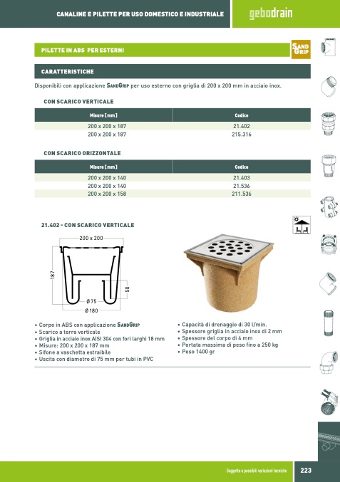 Disponibili con applicazione SandGrip per uso esterno con griglia di 200 x 200 mm in acciaio inox.