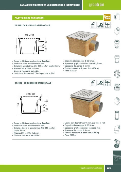 • Uscita con diametro di 75 mm per tubi in PVC