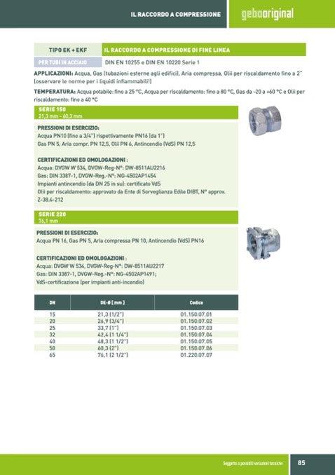 APPLICAZIONI: Acqua, Gas (tubazioni esterne agli edifici), Aria compressa, Olii per riscaldamento fino a 2”