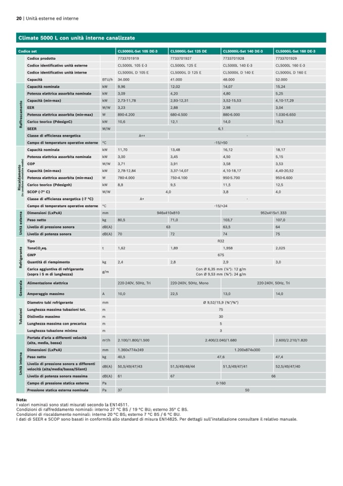 Condizioni di raffreddamento nominali: interno 27 °C BS / 19 °C BU; esterno 35° C BS.