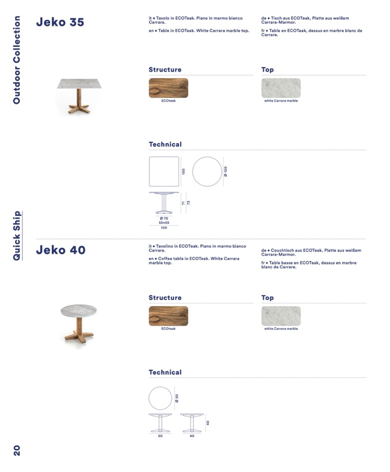 en • Table in ECOTeak. White Carrara marble top.