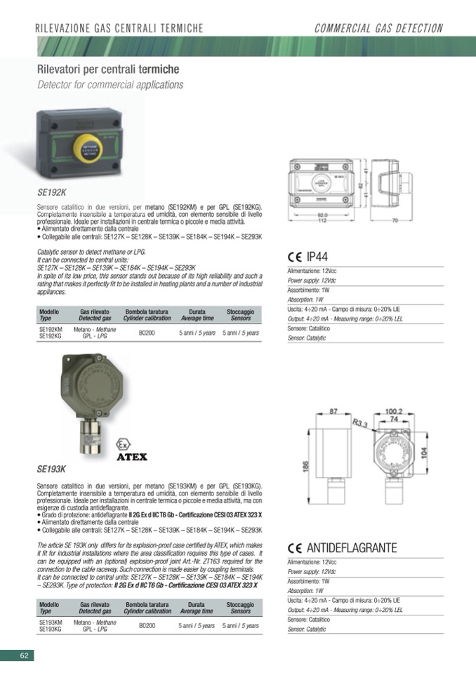 Sensore catalitico in due versioni, per metano (SE192KM) e per GPL (SE192KG).