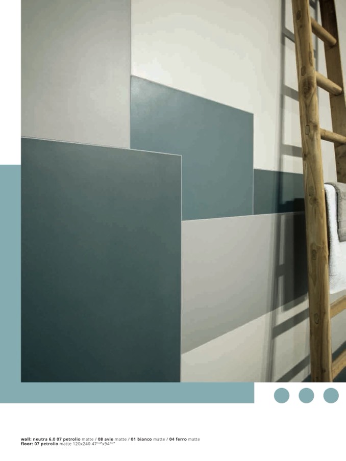 wall: neutra 6.0 07 petrolio matte / 08 avio matte / 01 bianco matte / 04 ferro matte