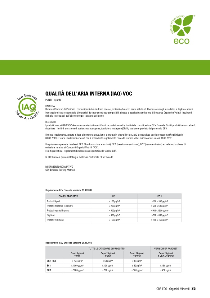 I prodotti marcati IAQ VOC devono essere testati e certificati secondo i metodi e limiti della classificazione GEV Emicode. Tutti i prodotti devono altresì