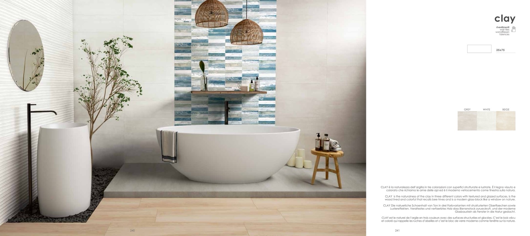 CLAY è la naturalezza dell’argilla in tre colorazioni con superfici strutturate e lustrate. È il legno vissuto e