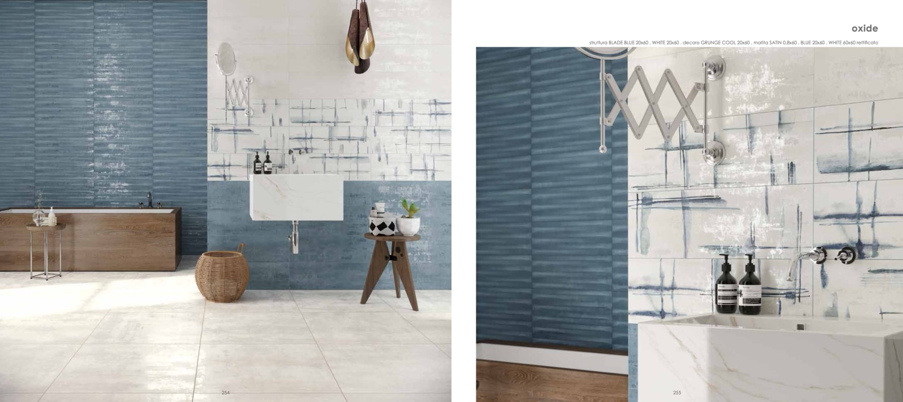 struttura BLADE BLUE 20x60 . WHITE 20x60 . decoro GRUNGE COOL 20x60 . matita SATIN 0,8x60 . BLUE 20x60 . WHITE 60x60 rettificato