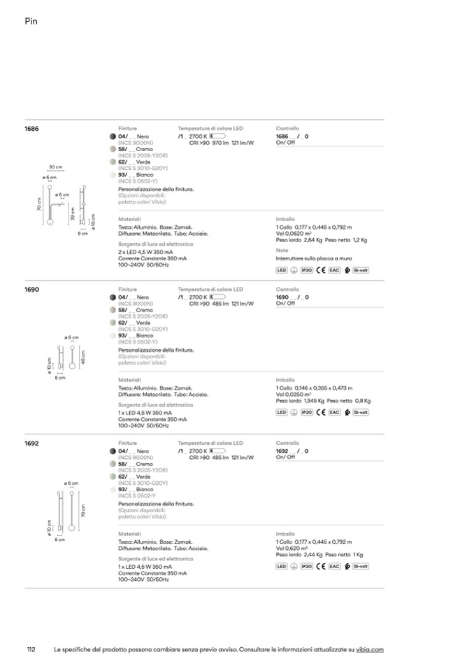 Le specifiche del prodotto possono cambiare senza previo avviso. Consultare le informazioni attualizzate su vibia.com