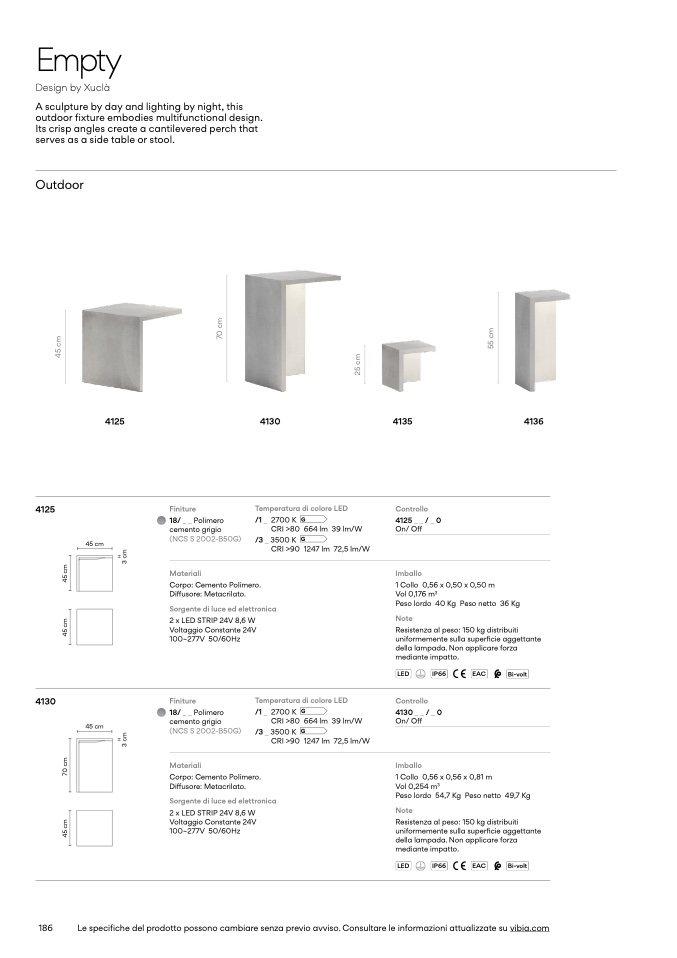 Le specifiche del prodotto possono cambiare senza previo avviso. Consultare le informazioni attualizzate su vibia.com