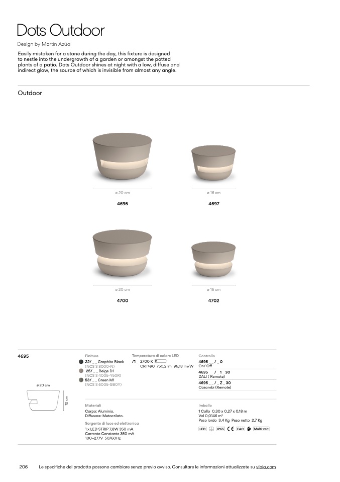 Le specifiche del prodotto possono cambiare senza previo avviso. Consultare le informazioni attualizzate su vibia.com