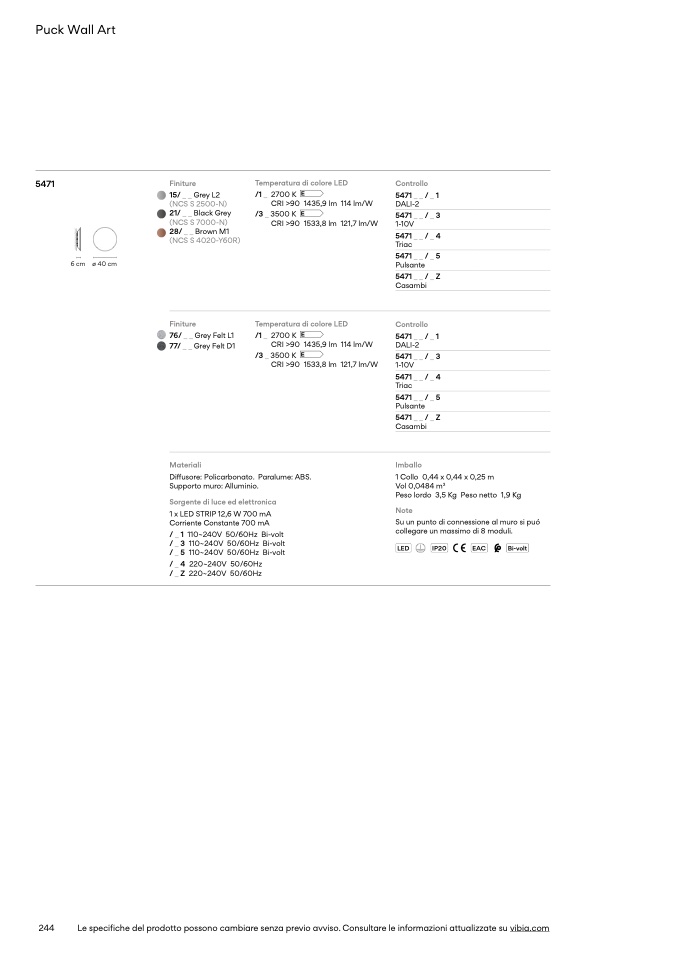 Le specifiche del prodotto possono cambiare senza previo avviso. Consultare le informazioni attualizzate su vibia.com