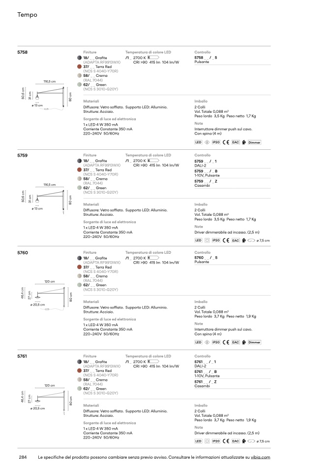 Le specifiche del prodotto possono cambiare senza previo avviso. Consultare le informazioni attualizzate su vibia.com
