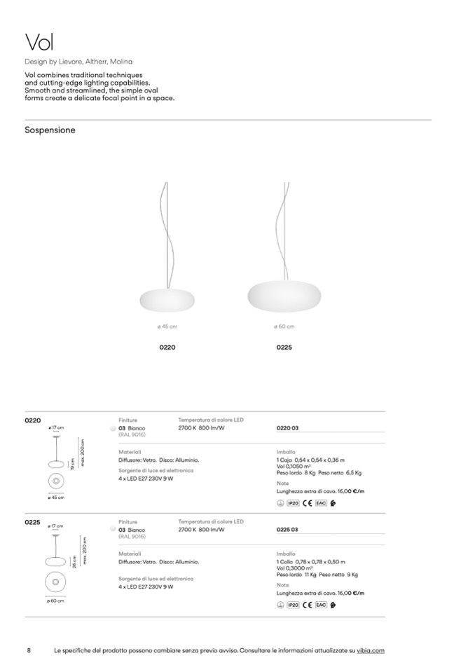 Le specifiche del prodotto possono cambiare senza previo avviso. Consultare le informazioni attualizzate su vibia.com
