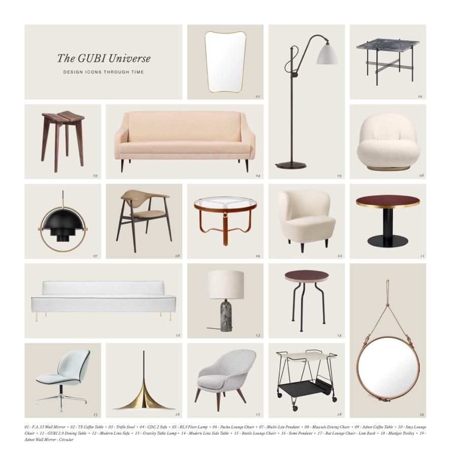 Chair • 11 - GUBI 2.0 Dining Table • 12 - Modern Line Sofa • 13 - Gravity Table Lamp • 14 - Modern Line Side Table • 15 - Beetle Lounge Chair • 16 - Semi Pendant • 17 - Bat Lounge Chair - Low Back • 18 - Matégot Trolley • 19 -