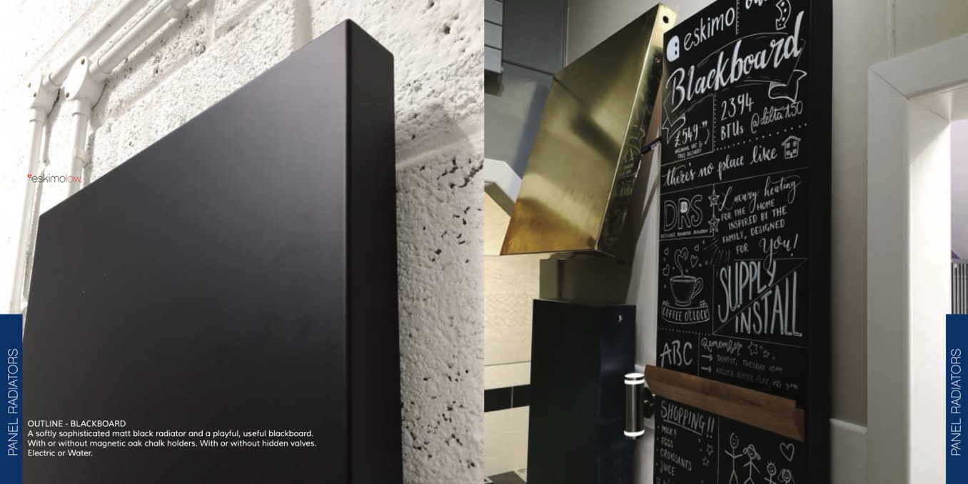 A softly sophisticated matt black radiator and a playful, useful blackboard.