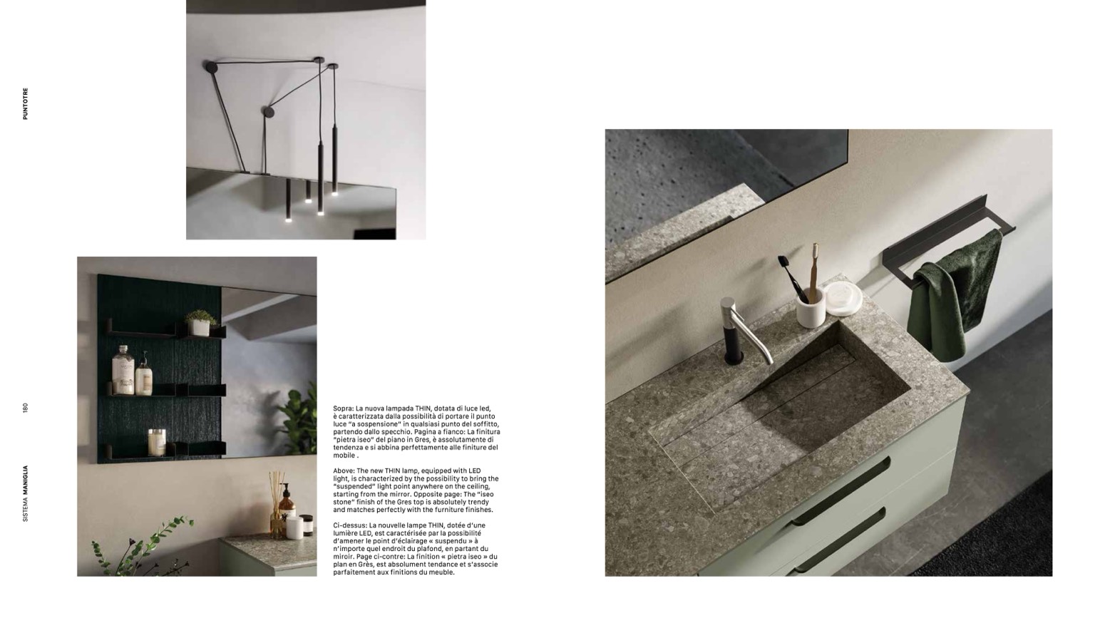 miroir. Page ci-contre: La finition « pietra iseo » du