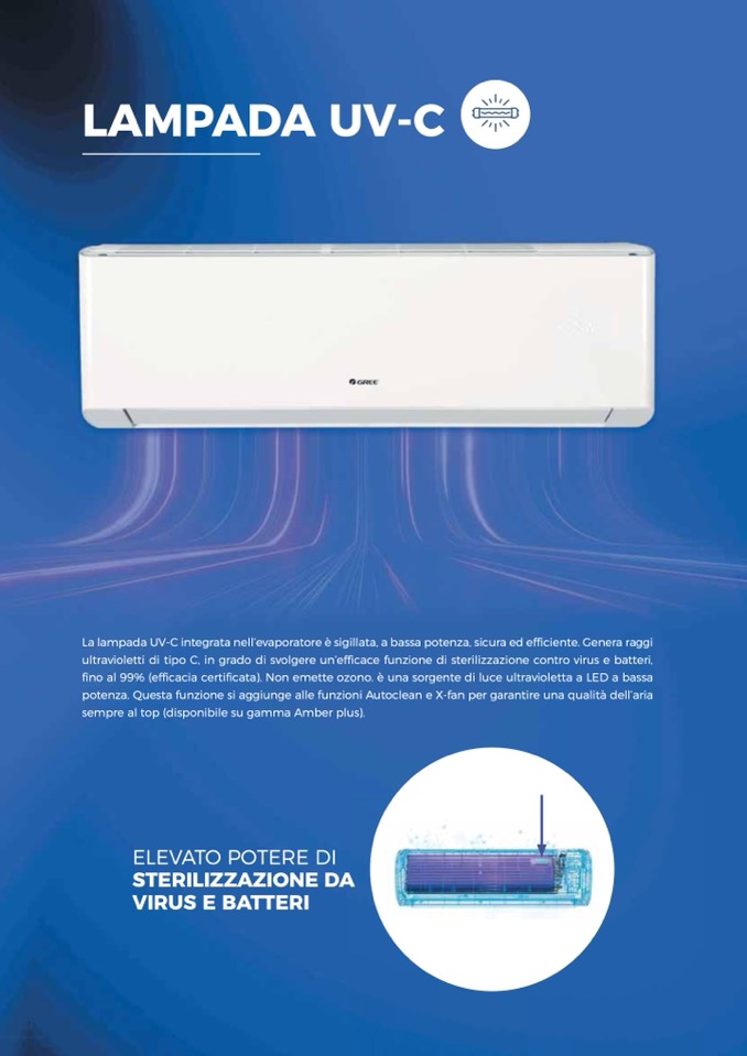La lampada UV-C integrata nell’evaporatore è sigillata, a bassa potenza, sicura ed efficiente. Genera raggi