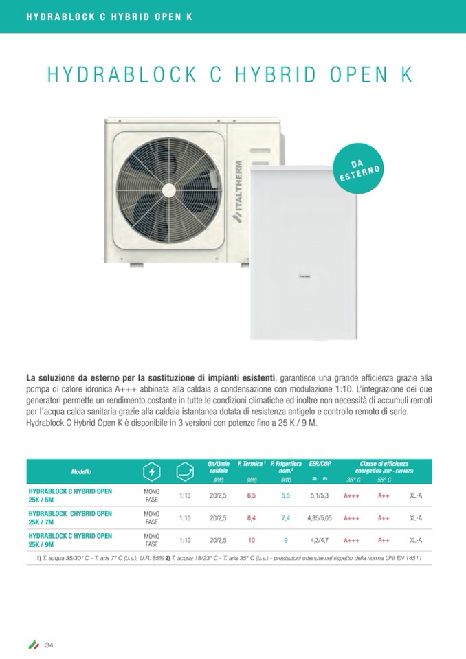 1) T. acqua 35/30° C - T. aria 7° C (b.s.), U.R. 85% 2) T. acqua 18/23° C - T. aria 35° C (b.s.) - prestazioni ottenute nel rispetto della norma UNI EN 14511