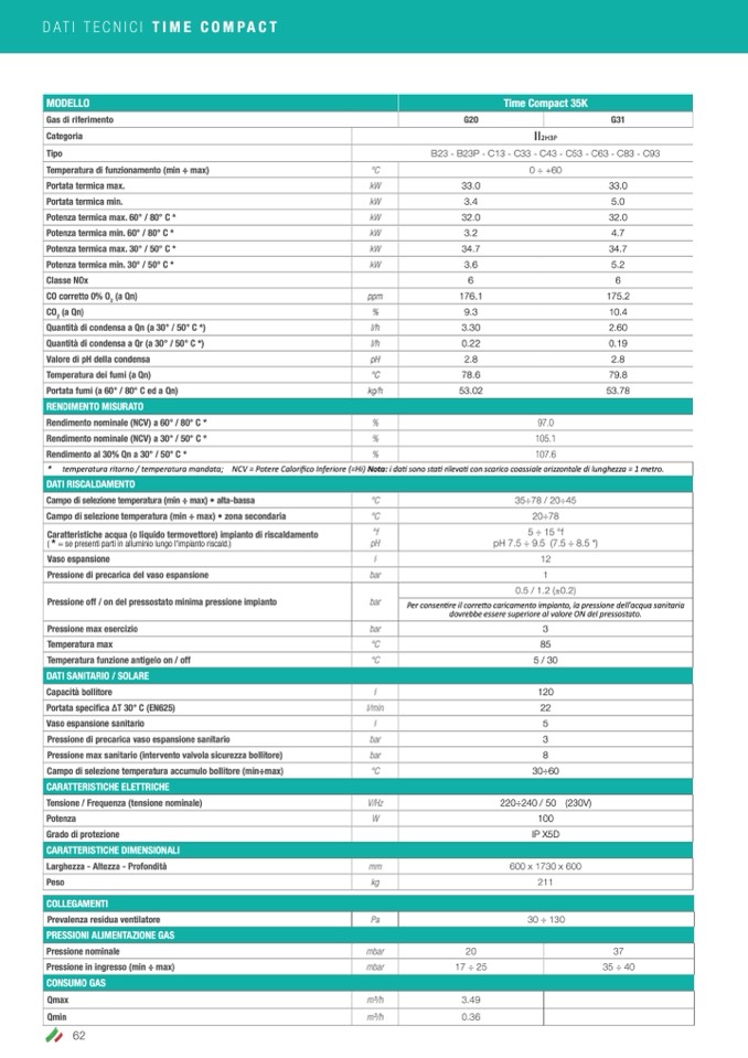 * temperatura ritorno / temperatura mandata; NCV = Potere Calorifico Inferiore (=Hi) Nota: i dati sono stati rilevati con scarico coassiale orizzontale di lunghezza = 1 metro.