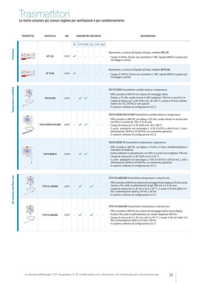 Pa: Pressione differenziale; °C/°F: Temperatura; % UR: Umidità relativa; m/s: Velocit