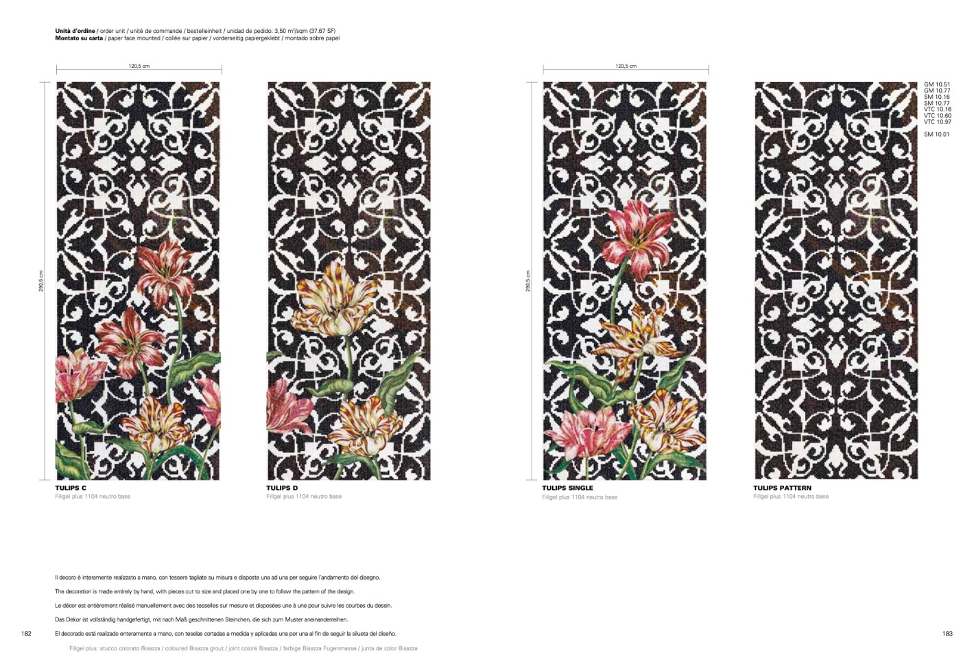 El decorado está realizado enteramente a mano, con teselas cortadas a medida y aplicadas una por una al fin de seguir la silueta del diseño.
