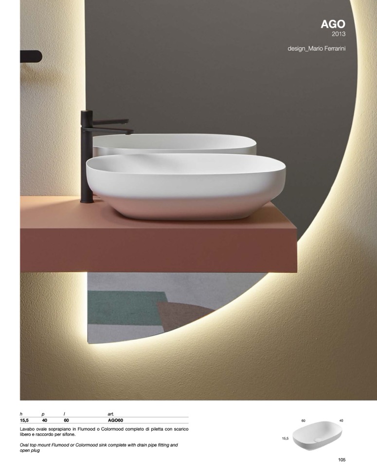 Lavabo ovale soprapiano in Flumood o Colormood completo di piletta con scarico