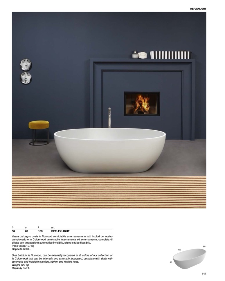 Oval bathtub in Flumood, can be externally lacquered in all colors of our collection or