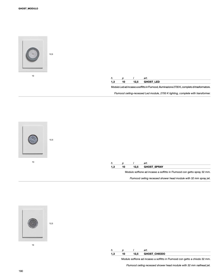 Flumood ceiling recessed shower head module with 32 mm spray jet.
